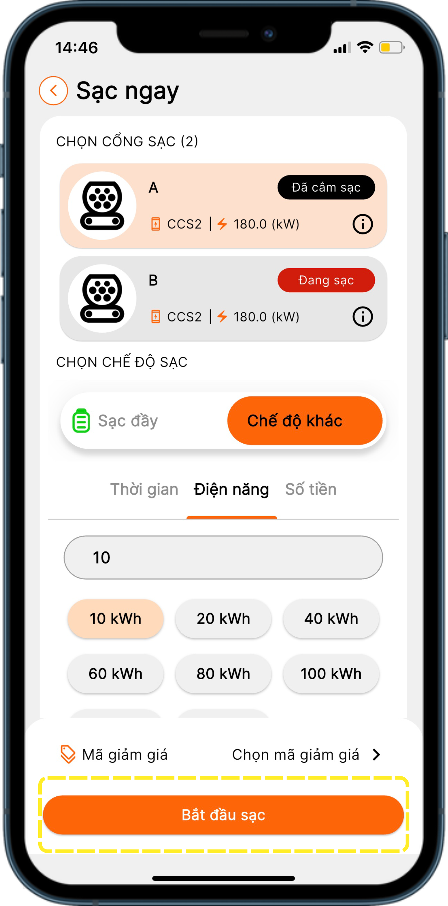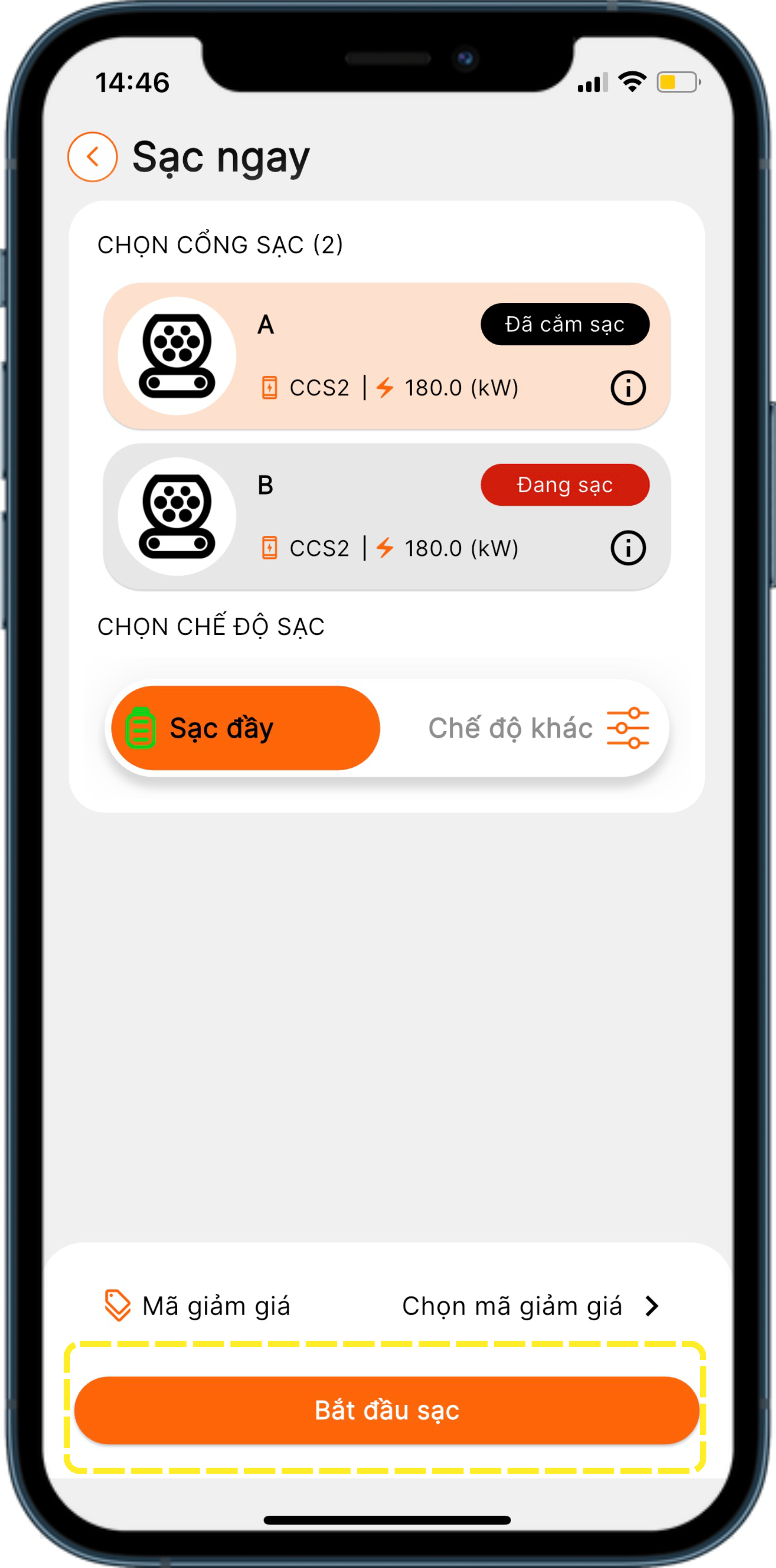 - Sau khi có được thông tin cổng sạc, nhấn “Sạc ngay”.
