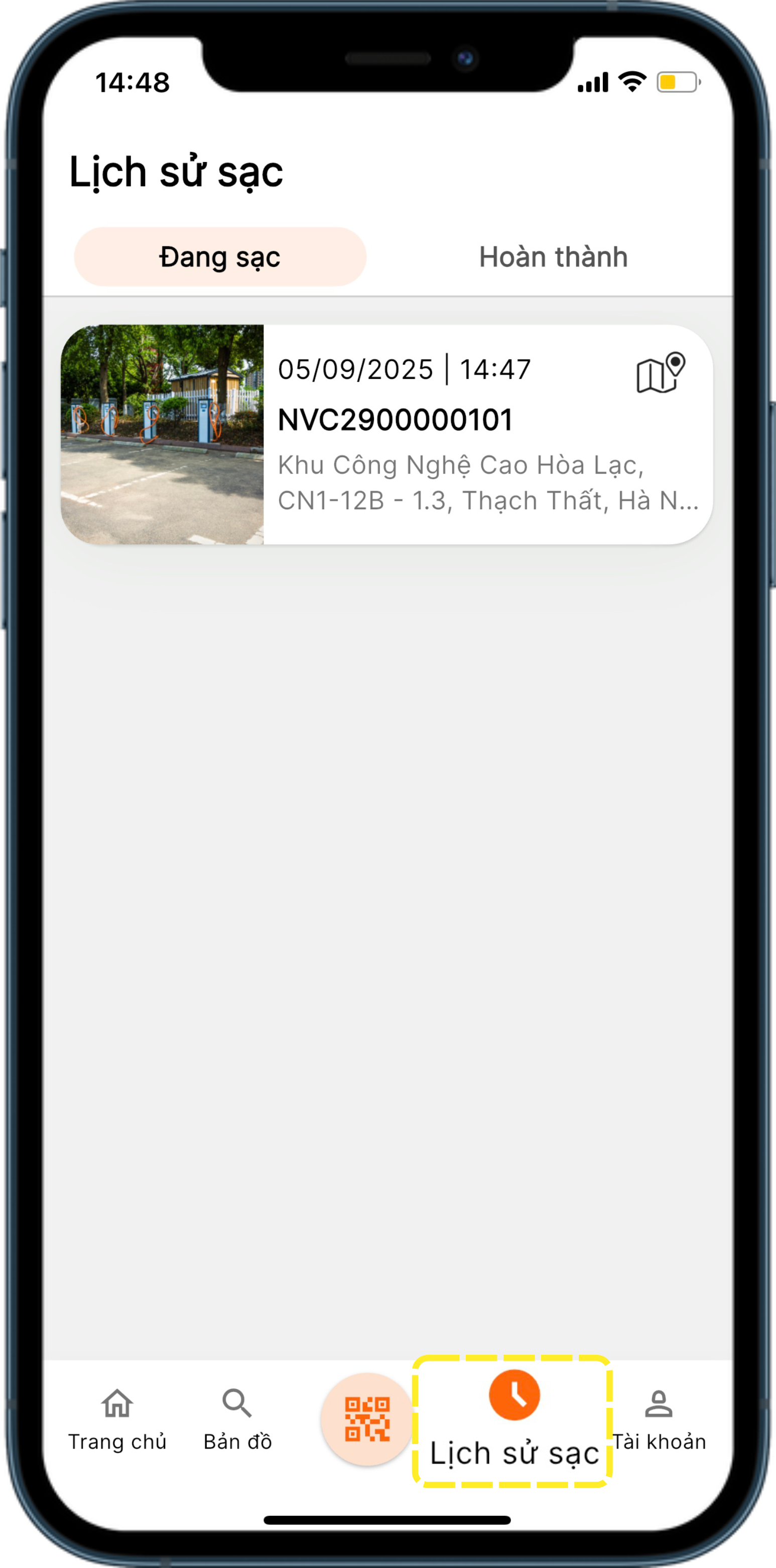 - Theo dõi phiên sạc đang diễn ra hoặc phiên sạc cũ trong “Lịch sử sạc”.