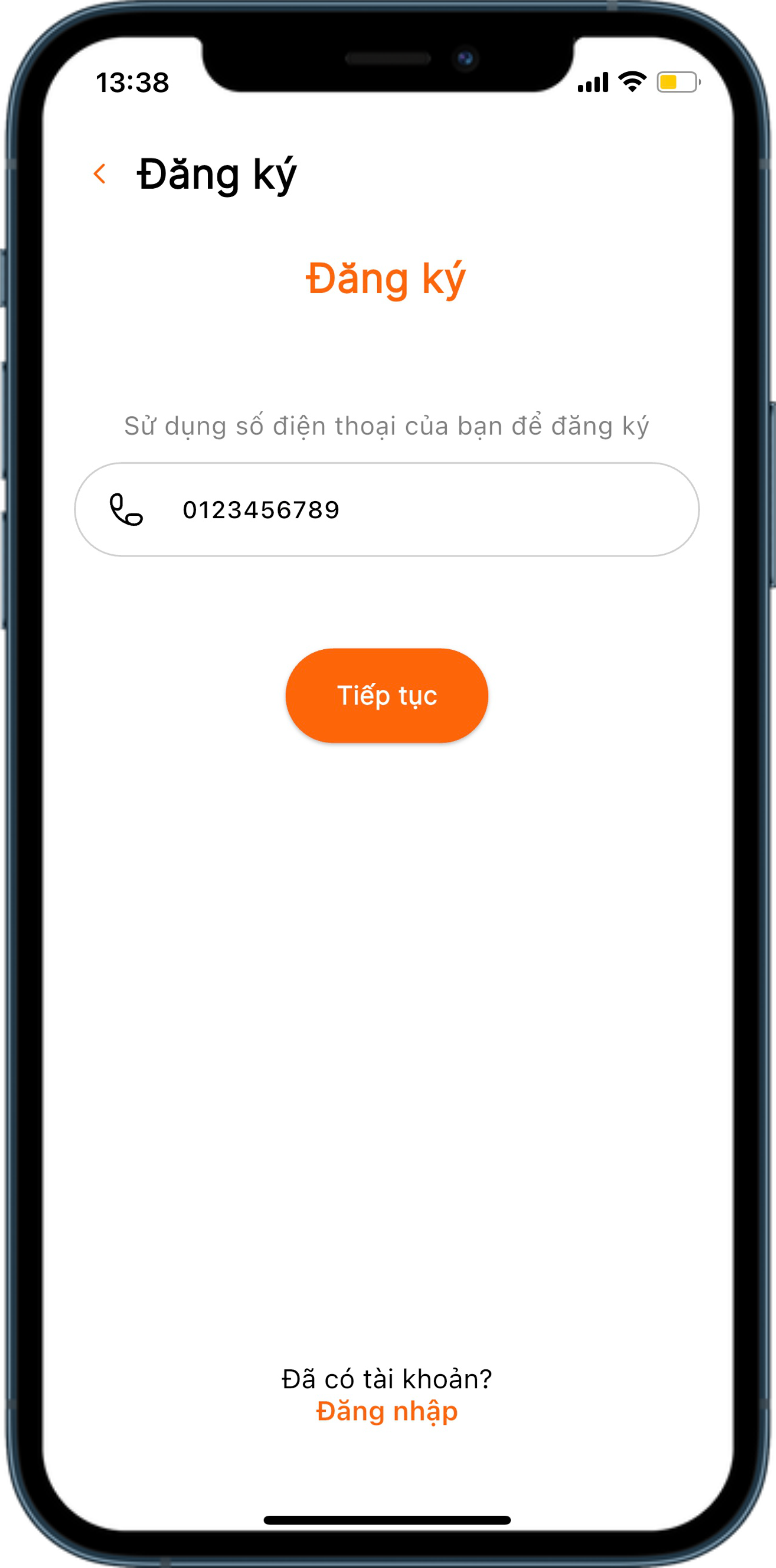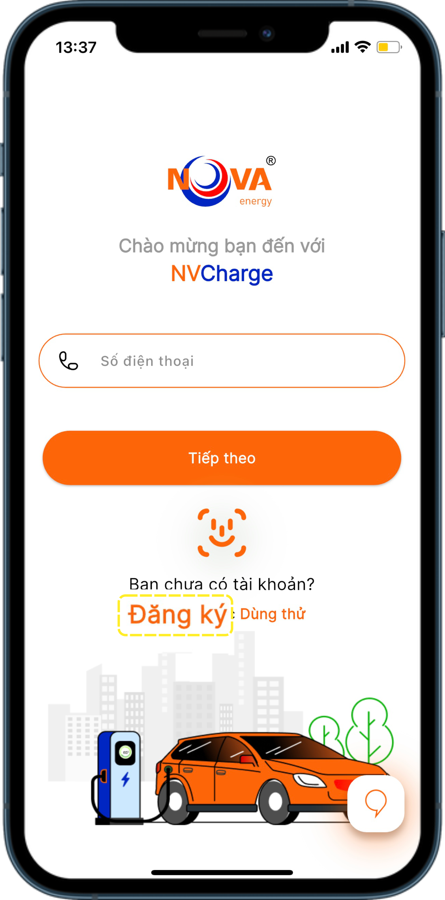 - Mở app NVCharge và Nhấn “Đăng ký”.